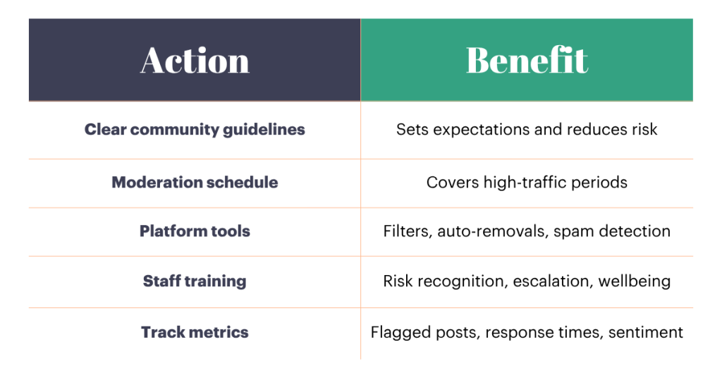 There are immediate steps you can take to protect your community and reduce risk. These quick wins help you stay on top of conversations, safeguard staff, and maintain supporter trust while you plan a more comprehensive moderation strategy.