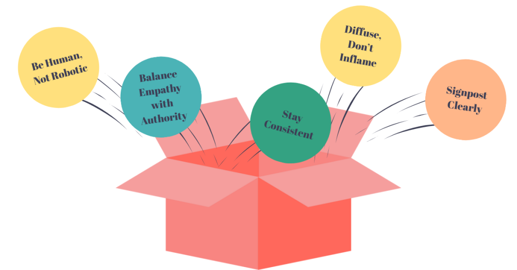 Tone is as important as rules or policies. Be human, empathetic, and consistent. Your aim should be to try to diffuse conflict rather than escalate it.