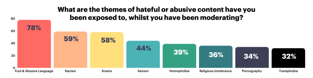 We expected this figure to be high, but we didn’t expect it to be 100%. Being exposed to hateful or abusive content can take its toll on even the most seasoned social media manager/moderator. This figure is a strong indicator that no one is safe and we should ensure we’re prepared and equipped to manage it.